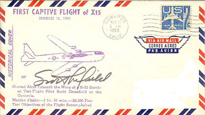 Space Cover #499: Mother Planes - Unsung and Seldom EasyAbove is a rather plain looking cover, postmarked almost 60 years ago on February 13, 1959, at Edwards, CA, and autographed by Captain Charles C. Bock, the chief test pilot for the NB-52A "mother plane" that would eventually launch the X-15 rocket plane and many more. This was the third B-52A bomber that was produced and was heavily modified by North American Aviation in 1958 to become the first X-15 mother plane. The aircraft was delivered to Edwards on November 14, 1958 and underwent a number of flight tests prior to the first X-15 captive flight on March 10, 1959. The cover above was postmarked during the time of those flight tests and autographed by the chief test pilot. Was it postmarked on a test flight date? I have never seen a log of the NB-52A test flights prior to the first captive flight, so I don't know. Has anyone else seen such a log?