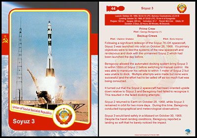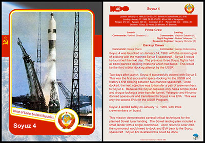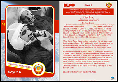 OK, here is the next batch. I decided to go with an image of Armstrong on the moon for the Apollo 11 card over a more famous shot. I just felt like the card should feature Armstrong.#48 Apollo 9  #49 Apollo 10  #50 Apollo 11  #51 Soyuz 6  #52 Soyuz 7  #53 Soyuz 8  |