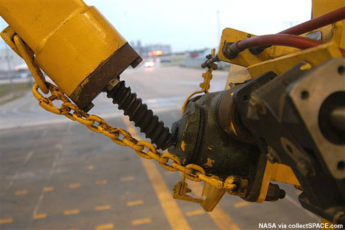 It just goes to show you, the Space Shuttle is not the only thing getting old in the program. GSE can be every bit as important as the vehicle it serves. I wonder what would have happened if it was being used and will this delay the stacking as they check out all of the attachments? The photo above shows a significant amount of corrosion on the lower end of the jackscrew housing. It would make me question the integrity of the rest of this apparatus as well as those others that have been in "storage" waiting for the program to resume. |