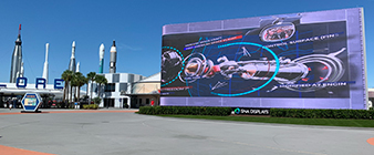 : NASA's Kennedy Space Center Visitor Complex has a new reason for you not to enter their gates — at least for the first six minutes of your visit. The Kennedy Entry Experience is a new 3,000-square-foot video display that tells of NASA's past, present and future with technology that makes images appear to launch from the screen. The Entry Experience takes the place of a prior John F. Kennedy-themed fountain that was added in 2013.
