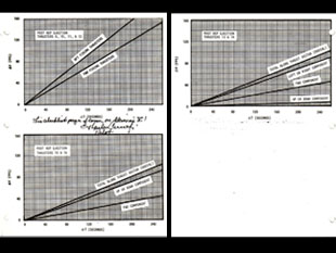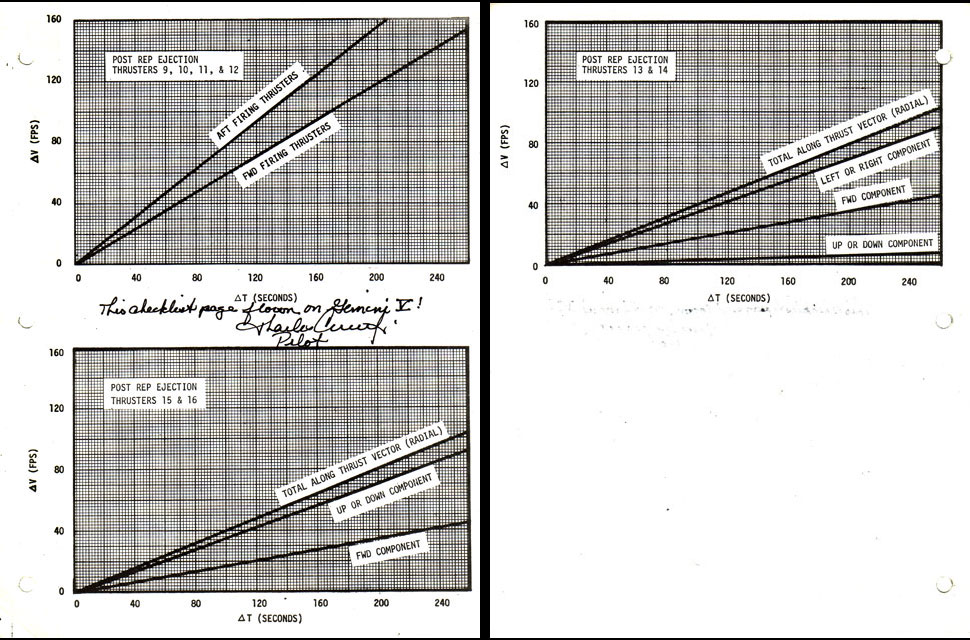 This page, removed post flight from the Gemini V Reentry Checklist Manual and notated as flown by Charles Conrad, may have been referenced by the crew after ejection of the rendezvous evaluation pod (REP). The graphs track the change in speed (FPS) over the change in time (seconds) during thruster burns.