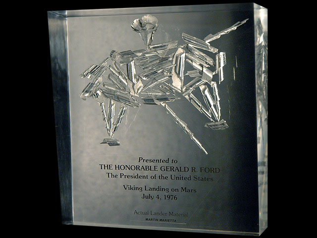 These metal shavings created during the production of the Viking I lander were arranged for presentation to the sitting U.S. President at the time of the touchdown, the Honorable Gerald R. Ford, by its primary contractor, Martin Marietta. NASA had hoped to land Viking I on July 4, coinciding with the nation's bicentennial, however imagery of the selected landing site revealed ground features that were deemed too rough for a safe touchdown. A new site was chosen in the Chryse Planitia and Viking I made the historic first landing on another planet. Presumeably, this lucite presentation is not in President Ford's archives because the date listed as the landing is incorrect. It is unknown if a corrected display was ever made and/or presented to President Ford.