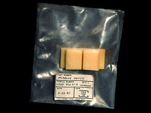This Valsalva device - basically a raised foam fixture that can be used to block the nostrils to clear the ears - was removed post-flight from Jeffrey Hoffman's EMU helmet to be discarded. Hoffman donned his helmet and spacesuit during STS-51D for an unscheduled spacewalk that called for David Griggs and him to attach a "flyswatter" device to the end of the robot arm in an attempt to activate a switch on the Syncom satellite that was deployed on the mission.