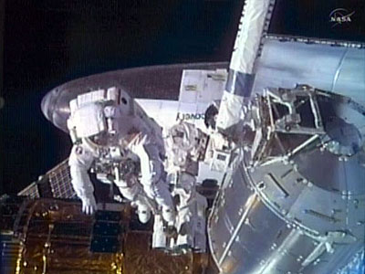 The spacewalkers first task is to run an extension cable, which will clear the way for the installation of the Permanent Multipurpose Module (PMM) delivered by space shuttle Discovery.