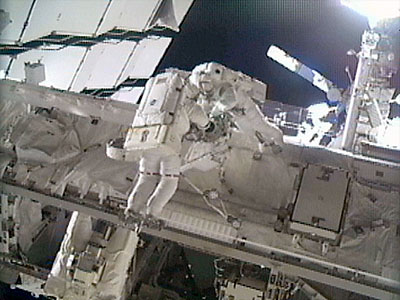 Today's excursion was the second for Chamitoff, who has now logged 13 hours and 43 minutes working in outer space. It was the ninth spacewalk for Fincke, who has a total of 48 hours and 37 minutes, ranking him no. 6 on the all-time list for time spent on EVAs.