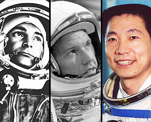 Solo in space: Valery Bykovsky, Gordon Cooper and Yang Liwei each flew history-making missions alone. (RSA/NASA/CSA) |