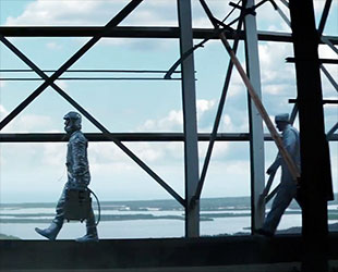 John Glenn (Glen Powell) crosses a walkway on the launch gantry in the feature film "Hidden Figures." (20th Century Fox) |