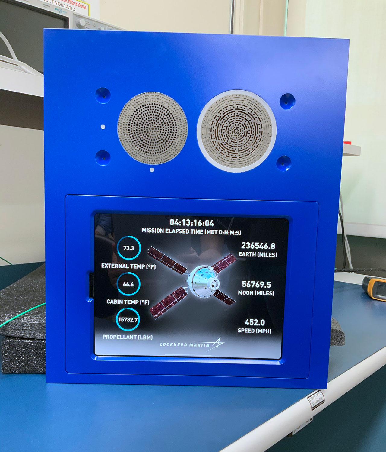 Callisto, seen on Lockheed Martin's workbench, features Amazon's Alexa voice assistant and Cisco's Webex video conferencing software. The payload will launch on the Orion spacecraft flying on NASA's Artemis I mission around the moon. (Lockheed Martin)