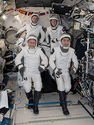 The four SpaceX Crew-11 members — Mike Fincke, Oleg Platonov, Zena Cardman and Kimiya Yui — gather during a suit verification check prior to their leaving the International Space Station. (NASA)