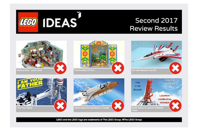 "Today we must unfortunately share the difficult news that, following the thorough LEGO Ideas Review, none of the 6 projects in review have been selected," wrote LEGO Ideas community specialist Hasan Jensen in a blog entry posted to the website. "We understand that the news comes as a disappointment to project creators, who put in a big effort in creating and promoting [their projects], but also for the many passionate fans who helped bring the projects to the 10K milestone."