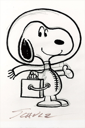 "We have [in the exhibit] the original drawing that Schulz did for the template for the Silver Snoopy award pin," said O'Cain of the "astronauts' personal award" presented for outstanding contributions to their missions' success. "It is fascinating because it was his first attempt at drawing Snoopy as an astronaut. You can actually see the pencil under-drawing as he grappled with where would Snoopy's arms be if he was carrying the [oxygen supply] suitcase and how would he draw the actual suit."