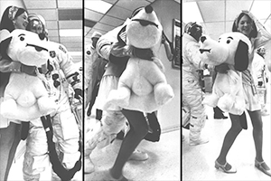 Standing in the hallway where the Apollo 10 astronauts would pass on their way to their ride to the launch pad, Flowers held a large stuffed Snoopy doll.