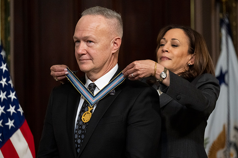 Former NASA astronaut Doug Hurley is awarded the Congressional Space Medal of Honor by Vice President Kamala Harris during a ceremony in the Indian Treaty Room of the Eisenhower Executive Office Building, Tuesday, Jan. 31, 2023, in Washington, DC. (NASA/Joel Kowsky)