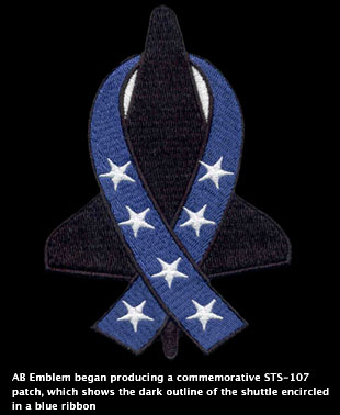 The company also began producing a commemorative STS-107 patch, which shows the dark outline of the shuttle encircled in a blue ribbon.