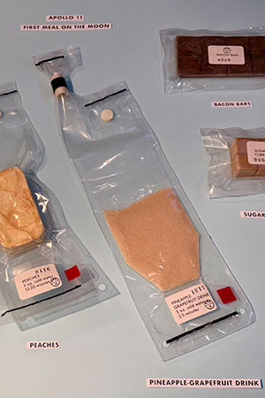 Coffee, peaches, pineapple-grapefruit drink, bacon bars and sugar cookie cubes — the first meal on the moon — can now be yours, as replicated by artist Ryan Nagata. (Ryan Nagata)