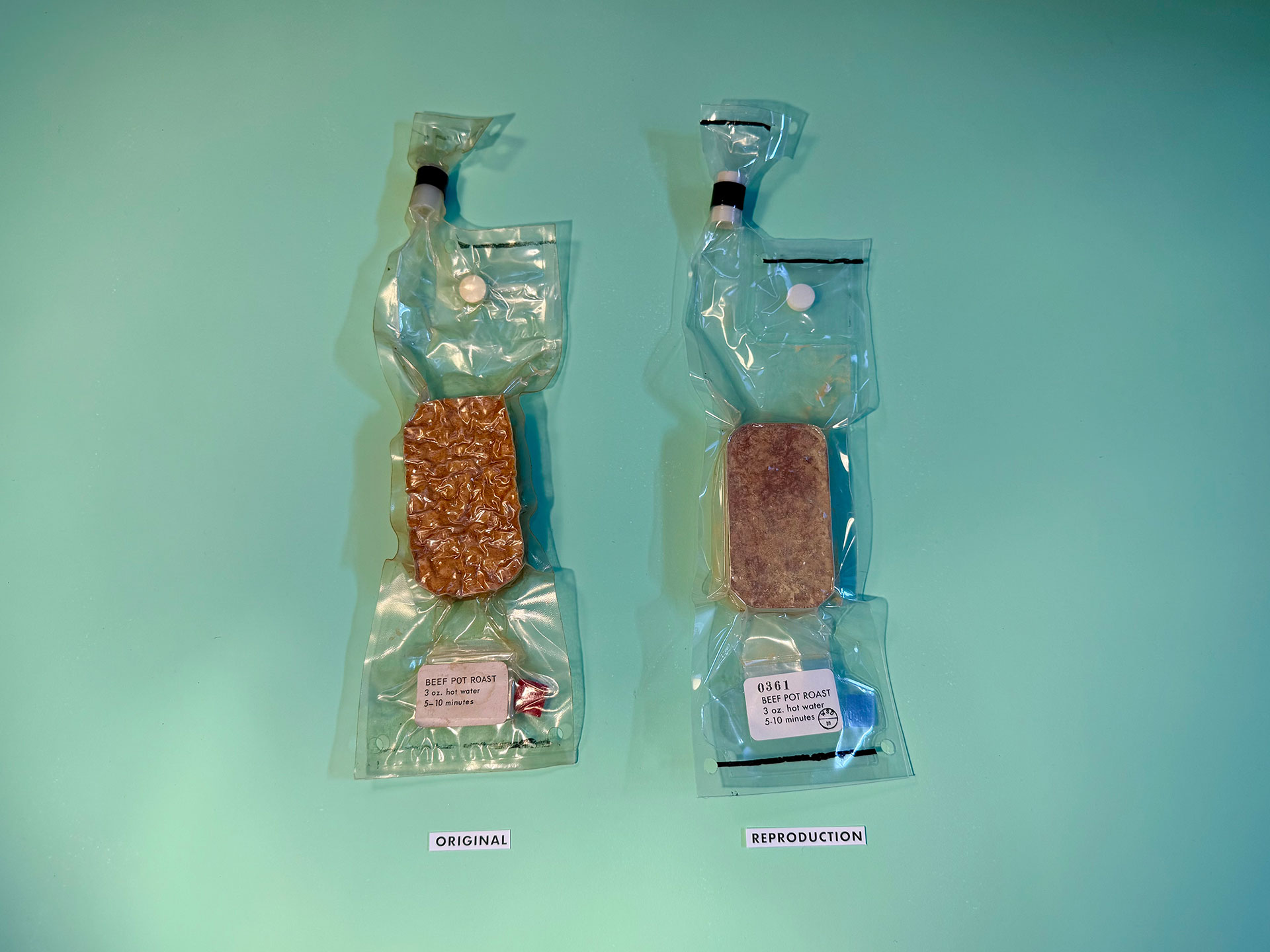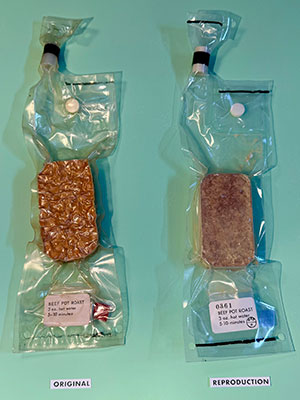 An authentic example of Apollo-era beef pot roast (at left) and artist Ryan Nagata's replica of the same, on sale on Etsy. (Ryan Nagata)