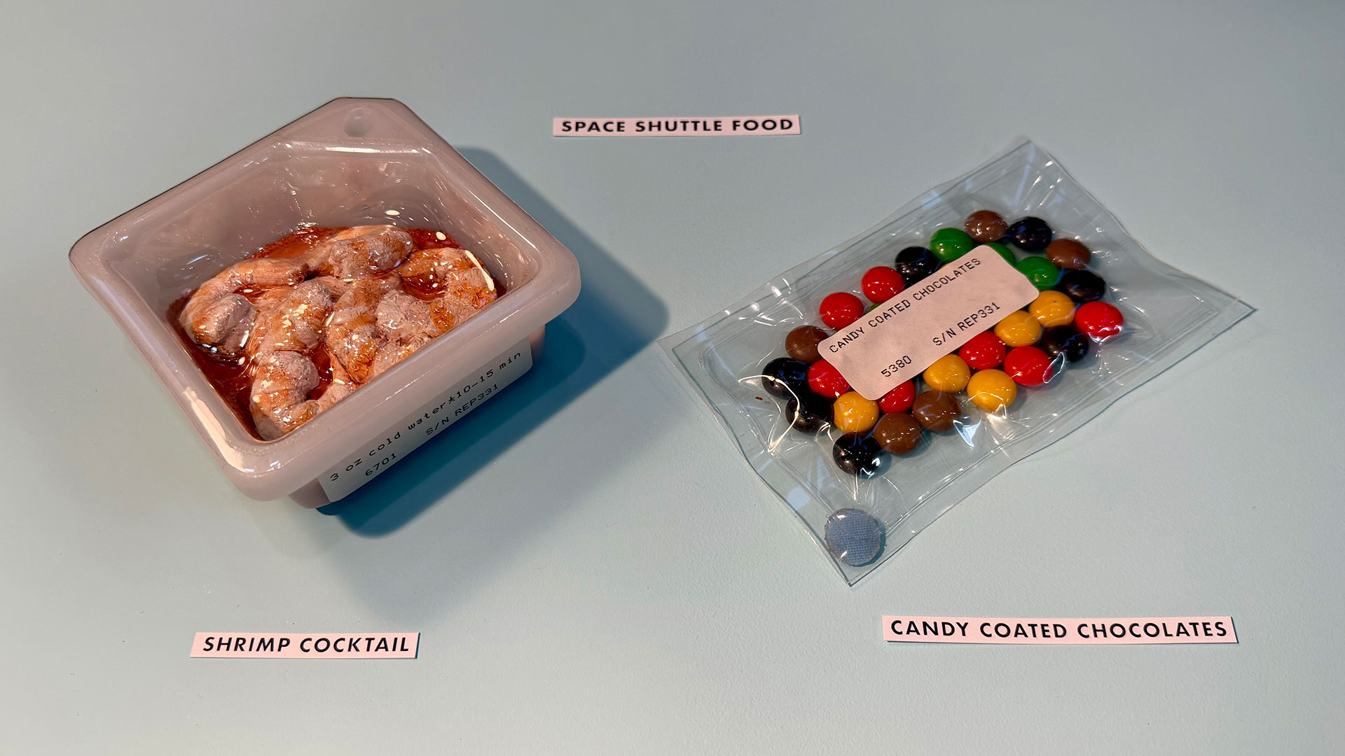 You can also make your own pairings. For example, a comparative set might be the Apollo spoon bowl-packaged shrimp cocktail with the early space shuttle-era plastic food dish shrimp cocktail. Which one looks more appetizing to you?