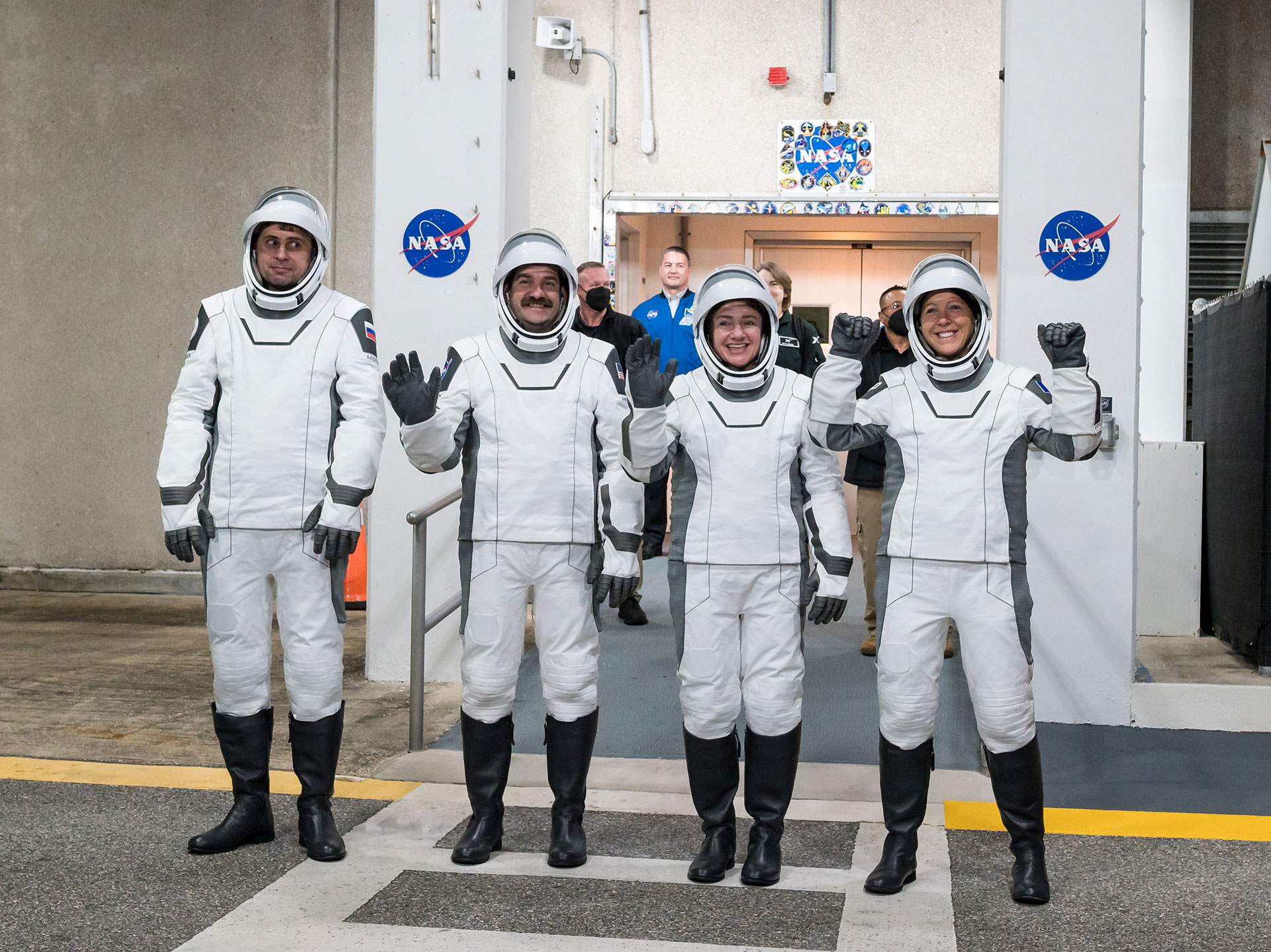 SpaceX Crew-12 members Andrey Fedyaev of Roscosmos, Jack Hathaway and Jessica Meir of NASA and Sophie Adenot with the European Space Agency pose before leaving for the launch pad at Kennedy Space Center, Feb. 13, 2026. (NASA/Aubrey Gemignani)