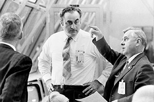 Apollo program director Rocco Petrone (center) is seen in 1971 in the launch control center that would later bear his name. (NASA)