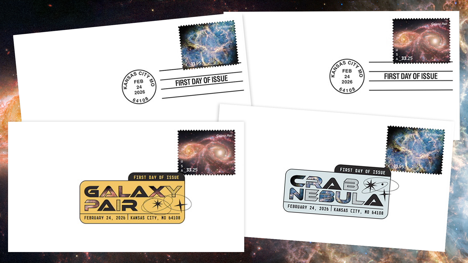 To commemorate the release, the postal service has prepared first day covers affixed with either the Priority Mail or Priority Mail Express stamps and postmarked in Kansas City, Missouri with Tuesday's date. There are two different cancellation devices: a standard circular date ink stamp with four "killer bars" and a digital color postmark in either light and dark blue for "Crab Nebula" or orange and black for "Galaxy Pair."