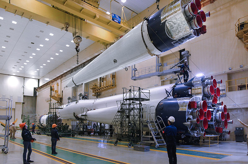 Since 2004, Russia's Soyuz-2 rocket has been painted greenish-gray with orange and white highlights, as seen here from July 2020. (RSC Energia) |