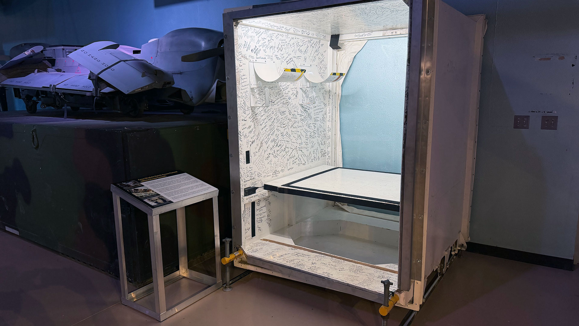 The Pima Air and Space Museum in Tucson, Arizona now displays the crew module access (or white room) tunnel from Orbiter Processing Facility-2 (OPF-2) at the Kennedy Space Center in Florida. During its last few years of service, the tunnel's walls were signed by astronauts, engineers, technicians, members of the press and special guests as both an "I was here" and farewell testament to the space shuttle program.