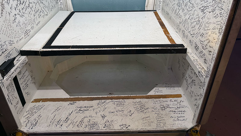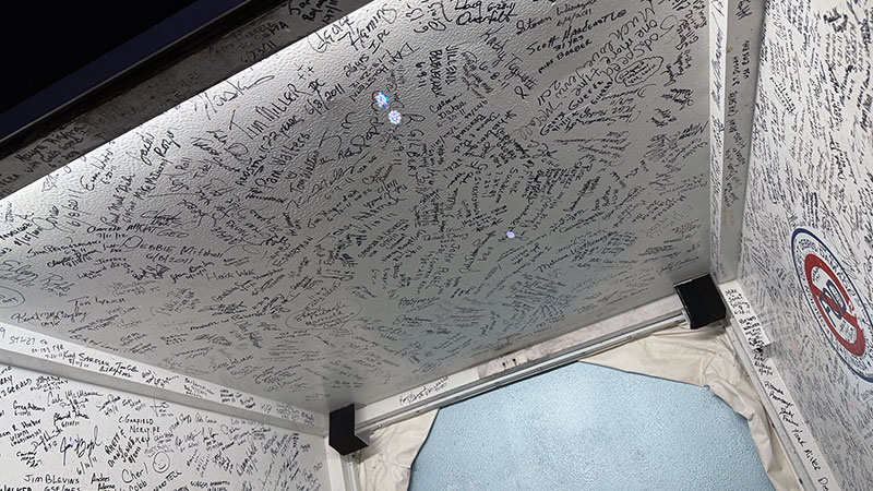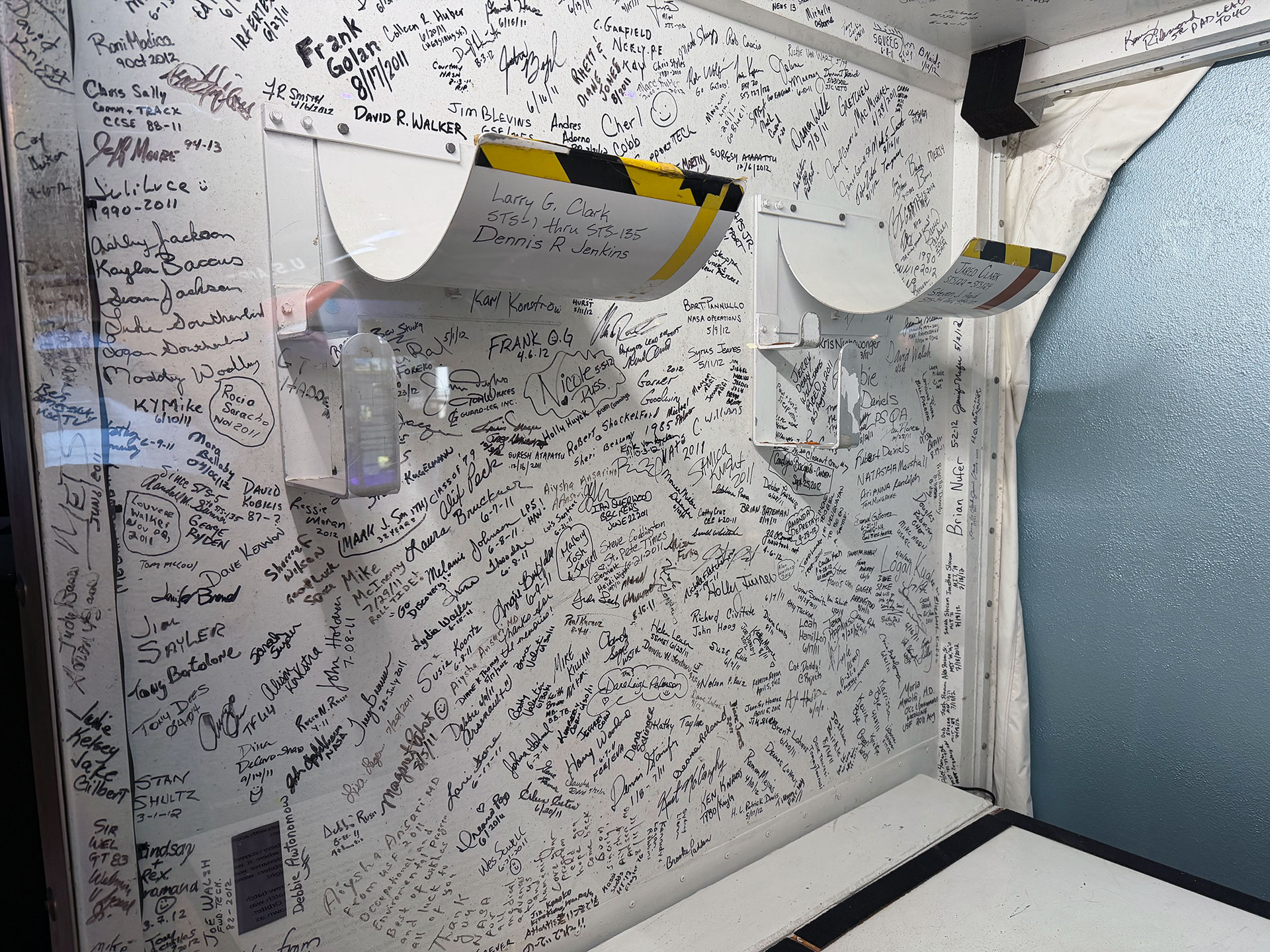 "Some of the more recognizable signatures are from the astronauts," said Clark, who signed the wall years before he became responsible for its fate. "One of the more impressive autographs is from Tom Stafford, who flew on Gemini 6, Gemini 9, Apollo 10 and the Apollo- Soyuz Test Project. Walt Cunningham from the Apollo 7 crew signed, as did Rick Hauck, who was the commander for the return to flight after the Challenger tragedy."