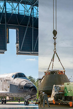 NASA has issued a draft request for proposals on how to move its historic flown space vehicles, from a large space shuttle orbiter like Discovery seen being rolled into the Smithsonian National Air and Space Museum's Steven F. Udvar-Hazy Center in 2012, to smaller capsules like Orion, seen being lowered onto a transport fixture at the naval base in San Diego, California in 2014. (collectSPACE/Ben Cooper / NASA/Cory Huston)