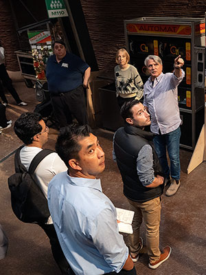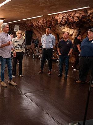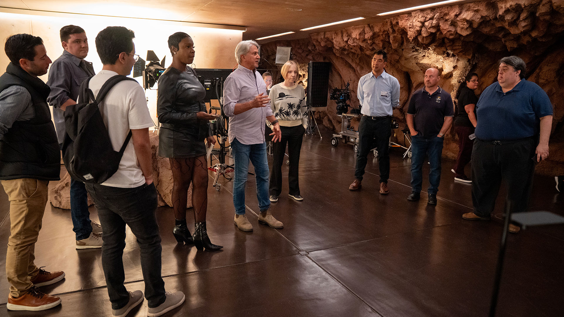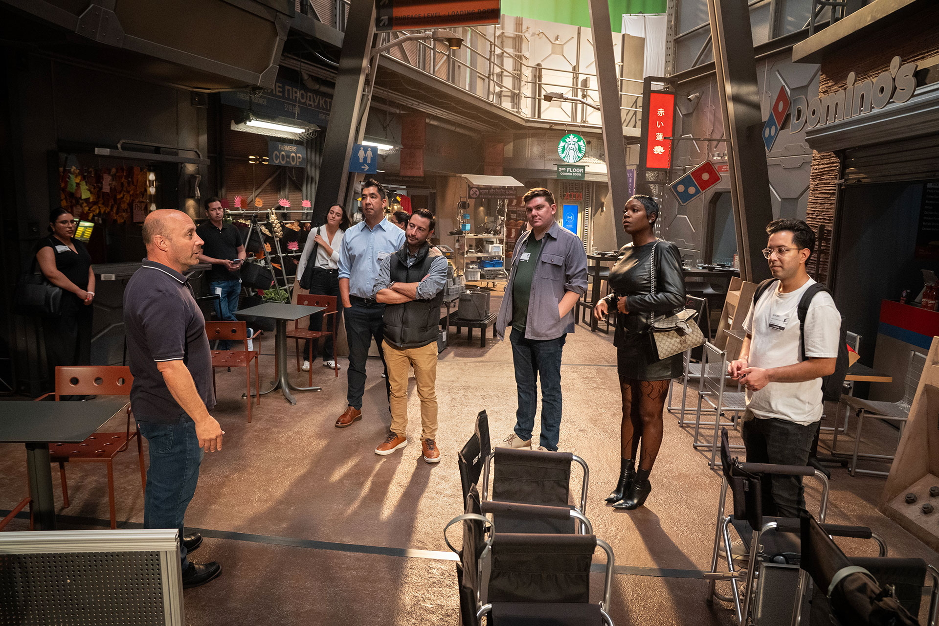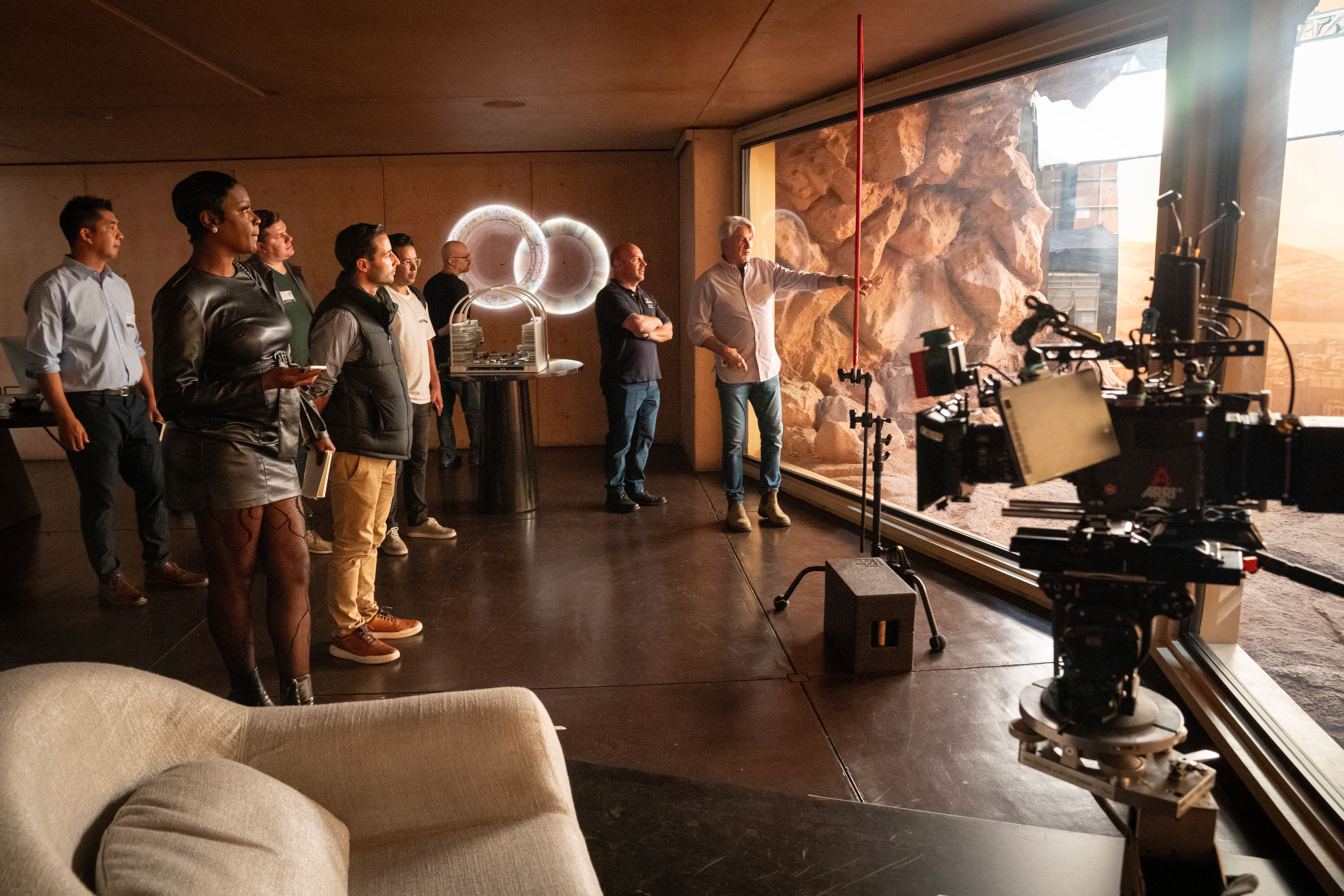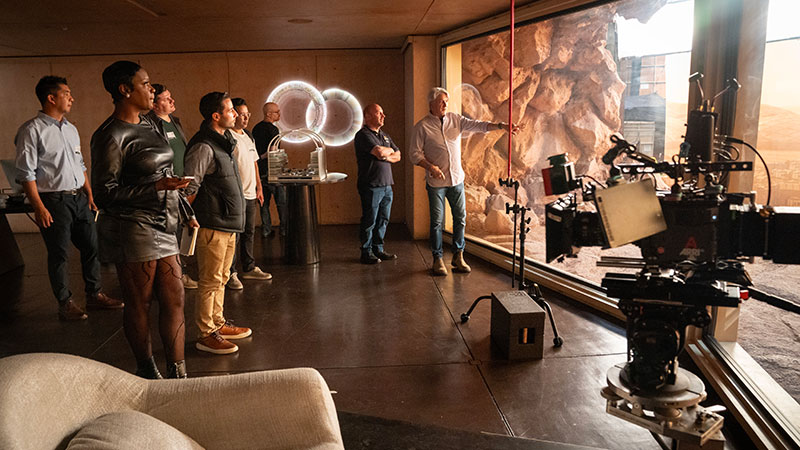 Bare Mars rock gives way to a corporate office on Mars in Season 5 of "For All Mankind." Seen here, production designer Seth Reed (sixth from right) and technical advisor Garrett Reisman (third from right) lead a press tour of the show's sets in 2024. (Apple TV)