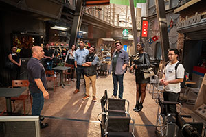 "For All Mankind" Season 5 production designer Seth Reed (at right, pointing upwards) and set decorator Lisa Clark (behind Reed) lead press through the Happy Valley marketplace. (Apple TV)