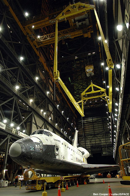 Workers at Kennedy Space Center are now preparing to lift Discovery by a 300-ton crane to a vertical position and then lower the orbiter onto the External Tank. Once done, Discovery will begin its eight hour journey to launch pad.