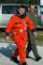 Led by Commander Eileen Collins, the crew of seven - Pilot Jim Kelly and Mission Specialists Soichi Noguchi, Stephen Robinson, Wendy Lawrence, Charles Camarda and Andy Thomas - boarded the Astrovan for the short trip out to the pad.