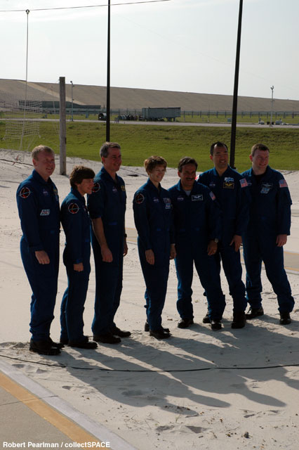 Discovery's crew (as pictured below from left to right): Andy Thomas, Wendy Lawrence, Steve Robinson, Eileen Collins, Charles Camarda, Soichi Noguchi and Jim Kelly.