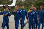 July 9, 2005 -- At approximately 6:30 p.m. EDT this evening, the STS-114 crew arrived at Kennedy Space Center in Florida for the July 13 launch of Space Shuttle Discovery. Landing aboard a NASA Gulfstream II jet, the seven astronauts flew in from Houston a day early to avoid treacherous travel conditions caused by Hurricane Dennis. The crew members will spend their next four days making final preparations for Wednesday's flight to the International Space Station.