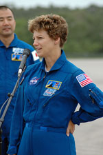 On Monday, Commander Eileen Collins and Pilot James Kelly flew the Shuttle Training Aircraft at KSC's Shuttle Landing Facility as part of the test. Today, the STS-114 crew members took time out of their schedule to answer questions from the media at Launch Pad 39B.