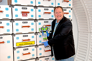 John Lasseter holds the Buzz Lightyear action figure donated to the National Air and Space Museum and points to where it will be on display this summer. (Smithsonian / Mark Avino)