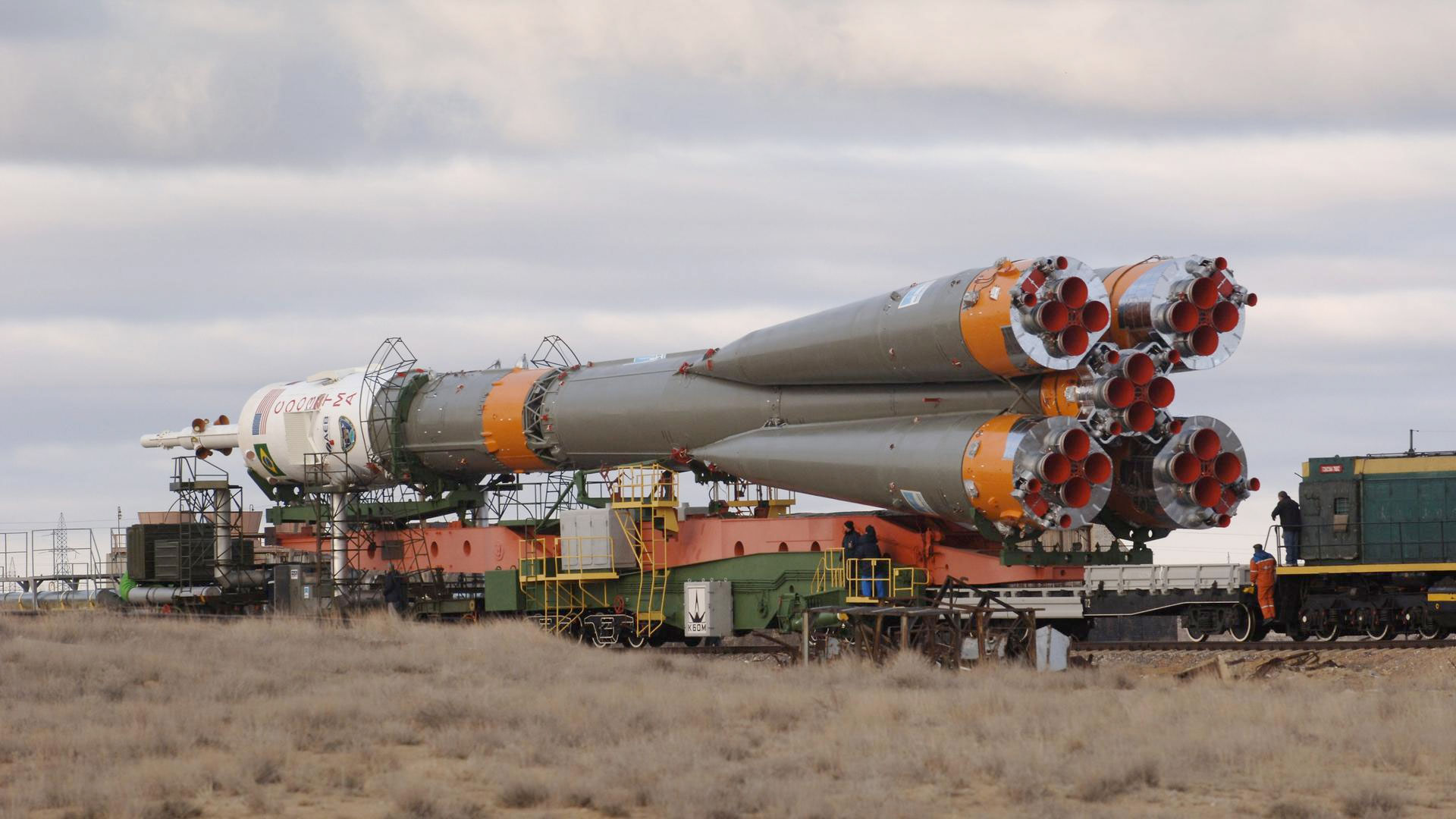 The Soyuz TMA-8 spacecraft and its booster rolled to the launch pad at the Baikonur Cosmodrome, Kazakhstan, March 28, 2006. (NASA/Bill Ingalls) |