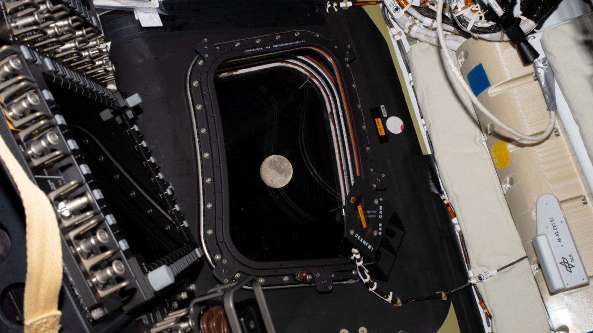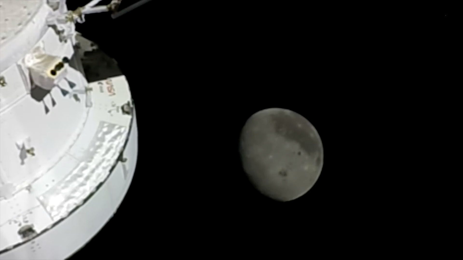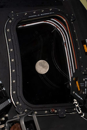 Before going to sleep on flight day 5, the Artemis II crew snapped this photo of the Moon, as it drew close in the window of their Orion spacecraft "Integrity," on April 6, 2026. (NASA)
