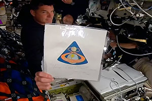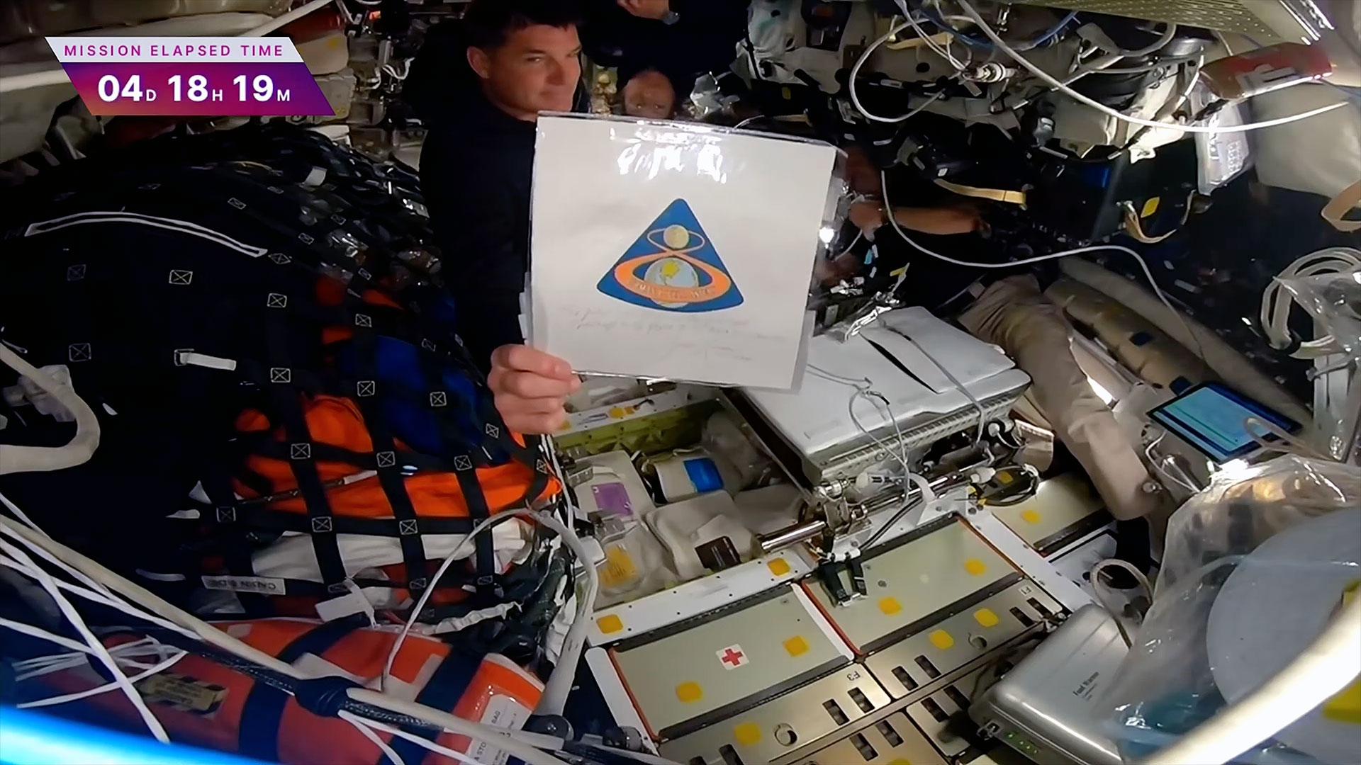 Artemis II mission specialist Jeremy Hansen displays an Apollo 8 Beta cloth patch that has now twice flown the moon: once with the late Jim Lovell on Apollo 8 in 1968 and now on Integrity. (NASA)