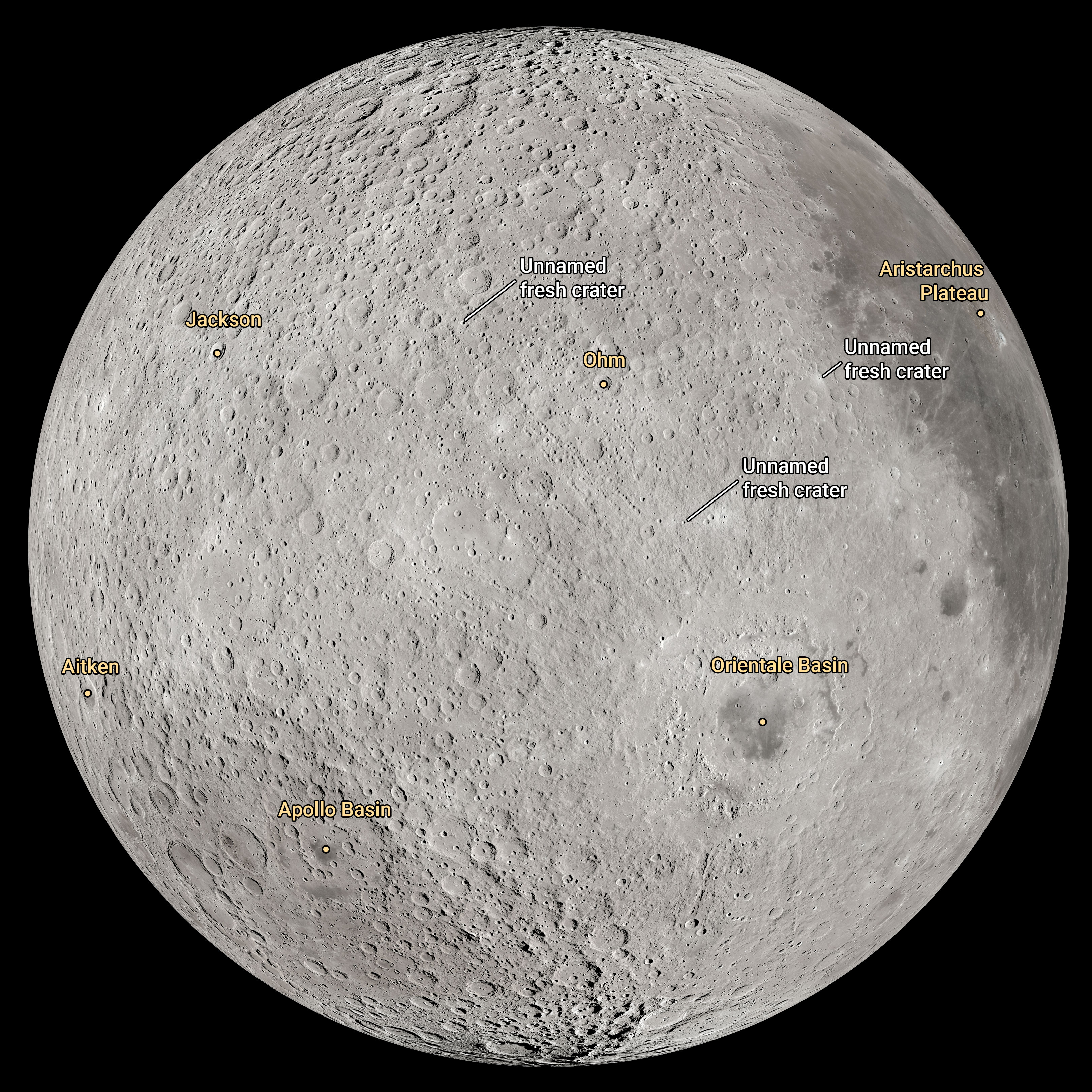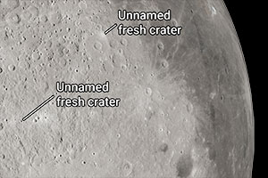 The Artemis II crew described two small craters and suggested provisional names for them. Just northwest of Orientale basin, is a crater they would like to name Integrity after their spacecraft. Just northeast of that crater, the crew suggested a crater be designated Carroll in memory of Reid Weisman's wife. (NASA)
