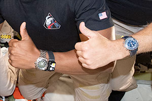 NASA issued the Artemis II crew with Omega Speedmaster X-33 chronographs for the mission. As this photo shows, some of the crew also had Breitling Navitimer Cosmonaute watches. (NASA)