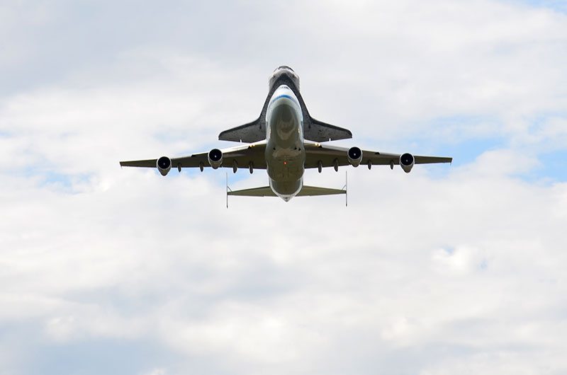 Space shuttle Discovery, mounted atop NASA's Shuttle Carrier Aircraft, approaches Washington Dulles International Airport for a low flyby before performing an historic aerial tour of the nation's capital.