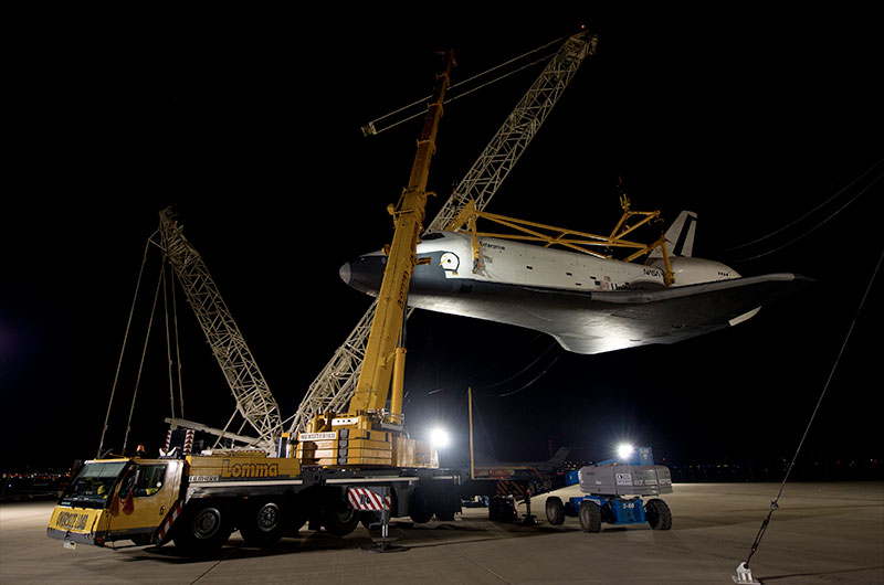 Space shuttle Enterprise is lifted in preparation for its mating to the Shuttle Carrier Aircraft early Friday morning, April 20, 2012. |