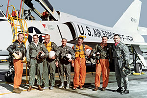 Astronaut flight suits have their origin in this 1961 photograph of the Mercury 7, which is said to have inspired NASA to adopt a uniform look for its then burgeoning corps. (NASA)