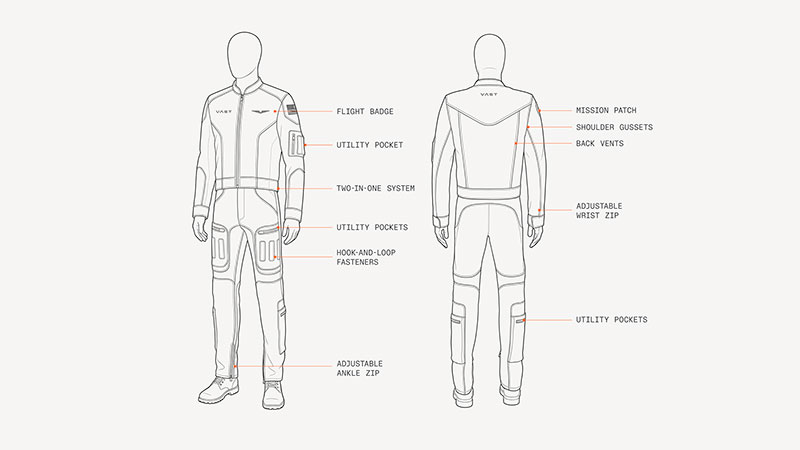 With utility in mind, Vast sought to create a highly functional flight suit optimized for both training on Earth and daily use aboard Haven-1 in orbit. (Vast) |