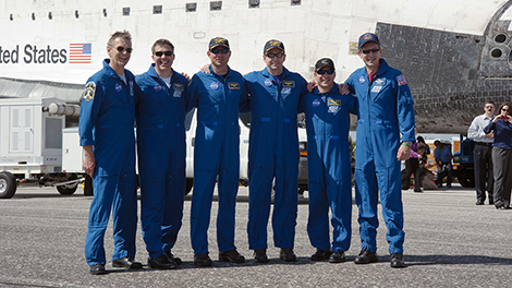The STS-132 crew members of space shuttle Atlantis pause for a post-landing photo opportunity. (NASA)