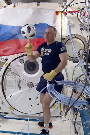 Cosmonaut Anton Shkaplerov with a regulation Telstar 18 soccer ball on board the International Space Station. The ball landed with Shkaplerov for use in the 2018 FIFA World Cup. (TV Roscosmos)