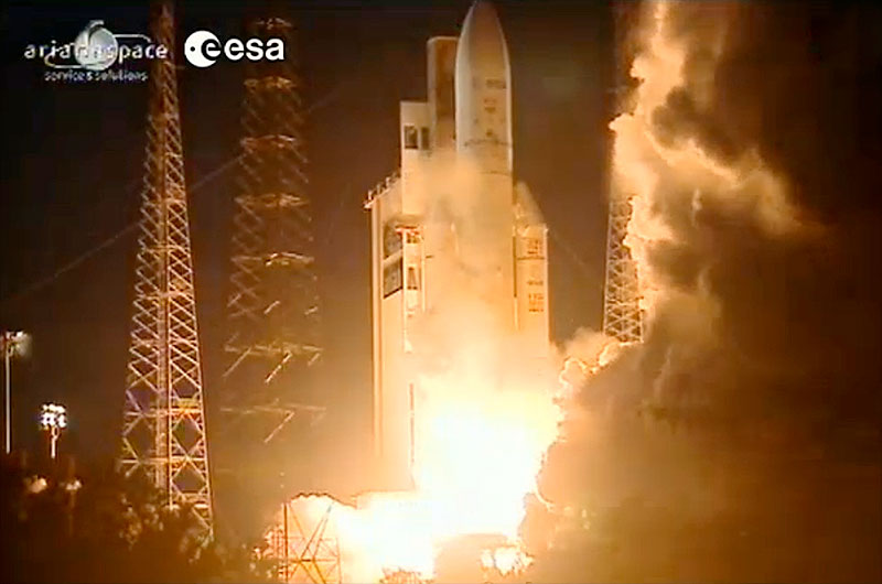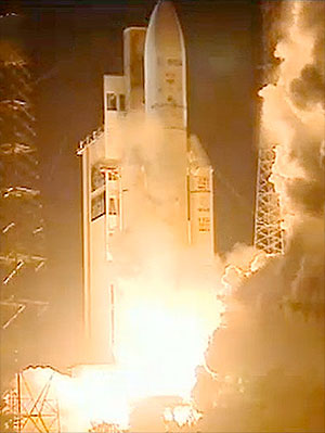 The "Albert Einstein" Automated Transfer Vehicle launches atop an Ariane 5 rocket from Kourou, French Guiana. (NASA TV)
