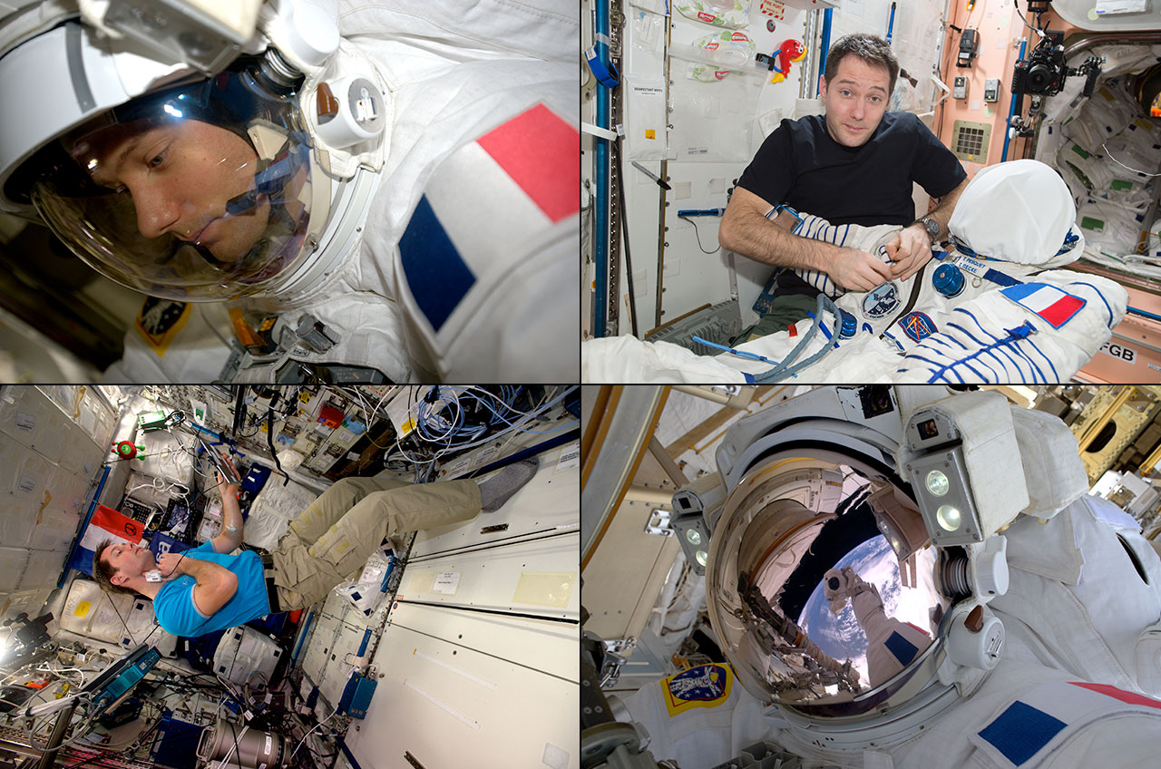 The blue, white and red of France's flag can clearly be seen decorating his spacesuit's left shoulder in both photos taken in January and March 2017. The first image was captured while Pesquet was still inside the station's Quest airlock, his face visible inside his helmet. The second shows Pesquet's selfie taken outside the orbiting outpost, his visor reflecting his outstretched arm holding the camera.