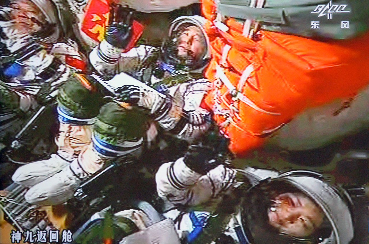 Video still showing the Shenzhou 9 crew aboard their spacecraft. From left, Liu Wang, Jing Haipeng and Liu Yang. (Xinhua)